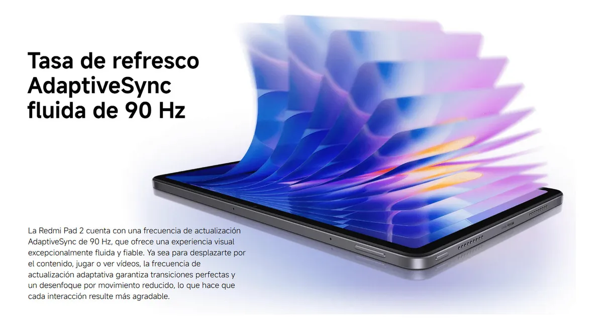 La Tablet Xiaomi Redmi Pad 2 es la elección ideal para quienes buscan una experiencia multimedia de alta gama en un formato portátil. Con su pantalla de 11 pulgadas y una resolución de 2560 x 1600 px, cada imagen y video cobra vida con colores vibrantes y una claridad excepcional. Disfruta de transiciones suaves gracias a su frecuencia de actualización de 90 Hz, lo que la convierte en una opción perfecta para juegos y navegación.
